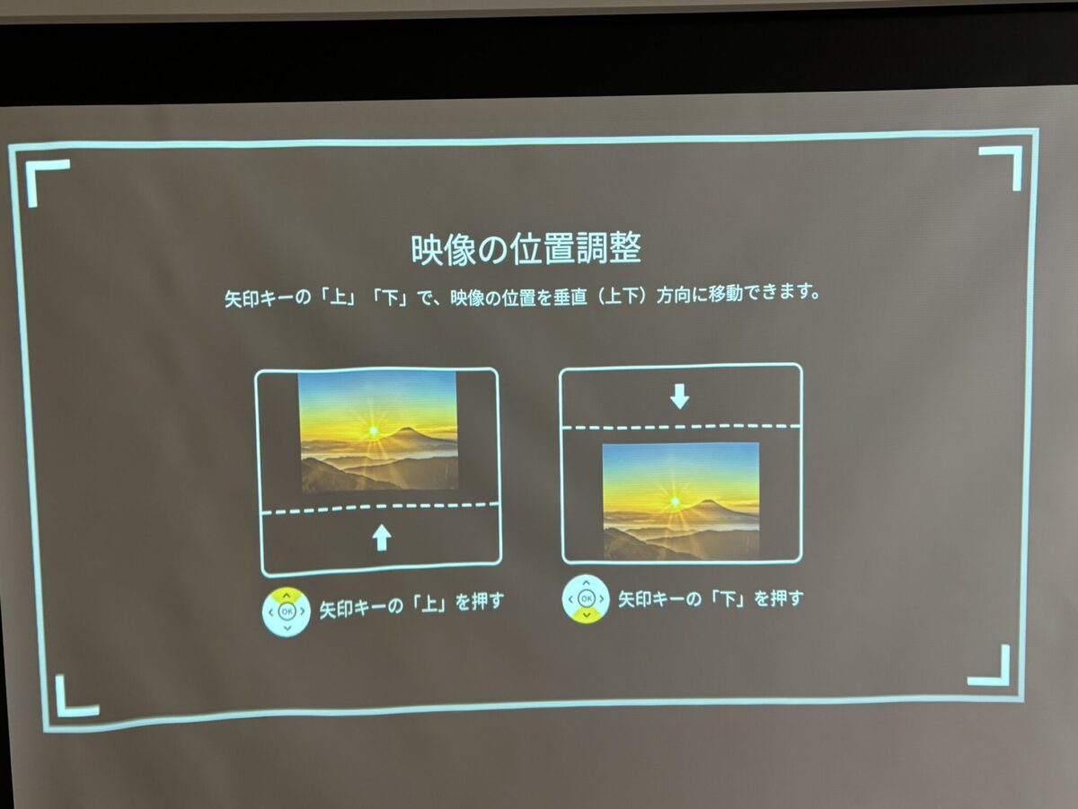 部屋が狭い、真正面に投影できない といった悩みがある方は、この台形補正機能を使って調整してみてくださいね。