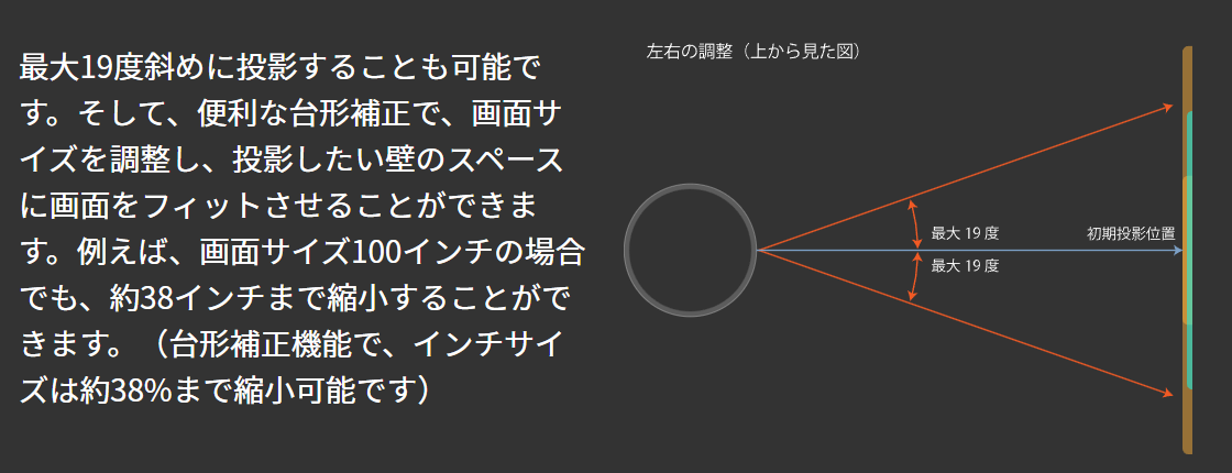 ちょっと斜め方向に投影したい…位だったらいけますが、右端に本体を設置して左端に投影するなどの距離だと厳しそうです。