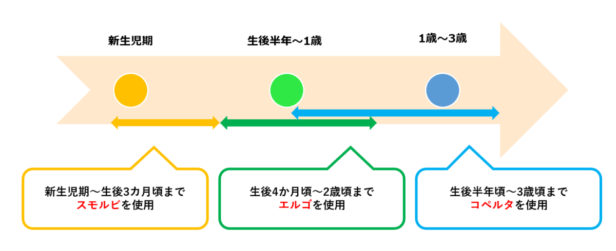 下記の表で、我が家での抱っこアイテムの使い分けを年齢別にまとめました。