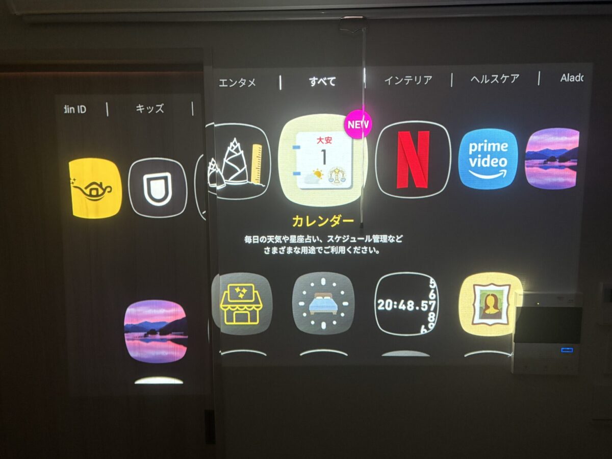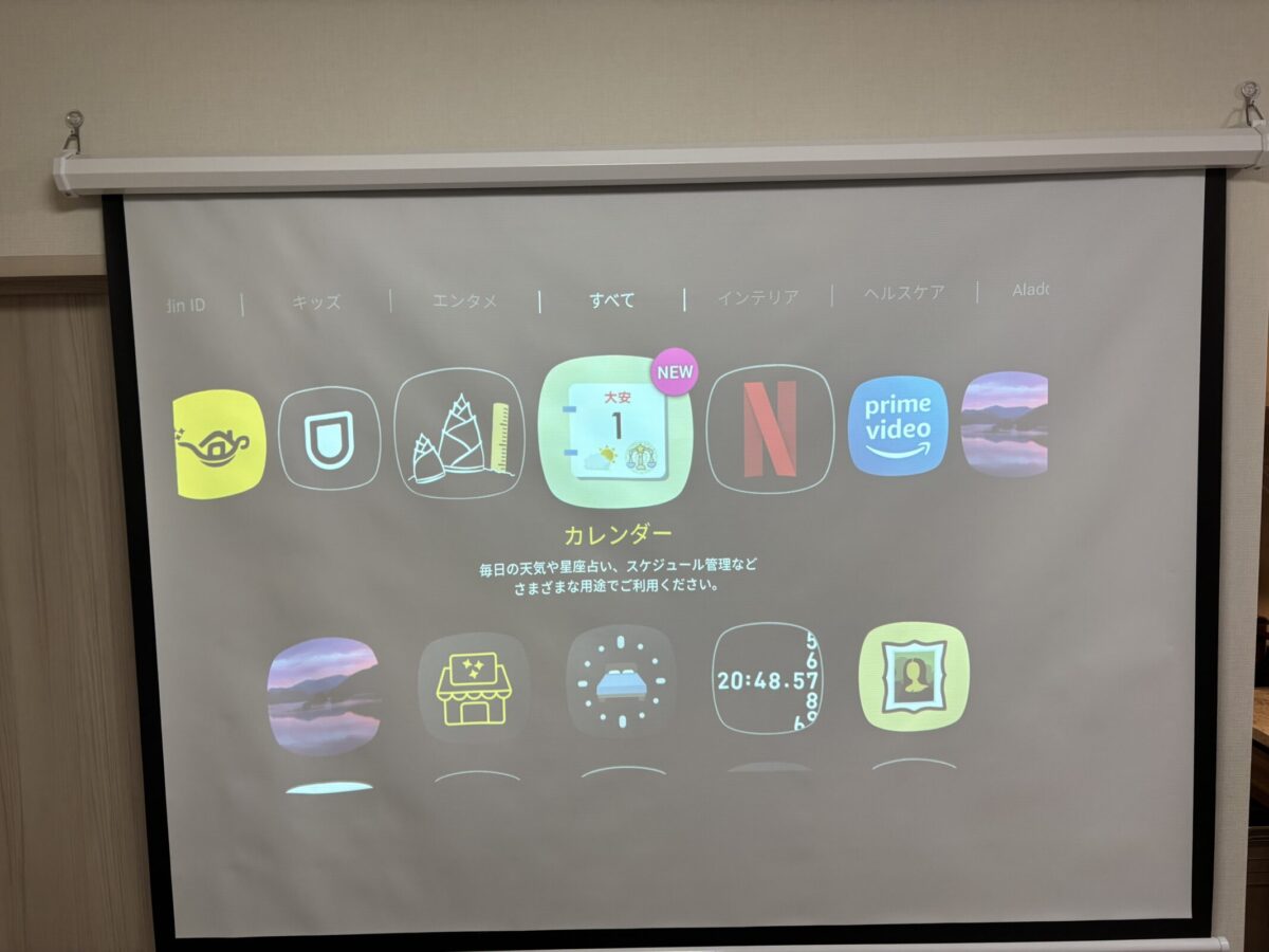 Aladdin Connecter2を使用して、スマホからNetflix動画を再生スタートすると、プロジェクター側から映像が投影されます。