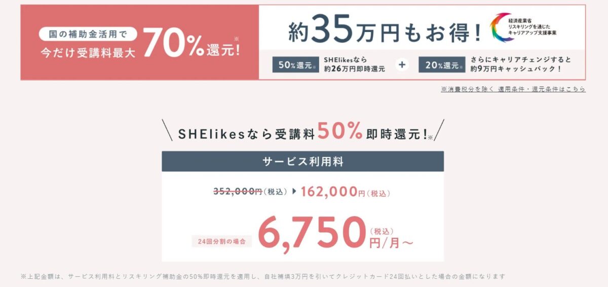 シーライクスの受講プランは、経済産業省「リスキリングを通じたキャリアアップ支援事業」の対象となっています。そのため、補助金を利用することができ、最大70%の還元を受けられます。※補助金対象・還元条件あり